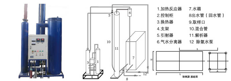 由于設(shè)備結(jié)構(gòu)簡(jiǎn)單,所以在設(shè)計(jì)和安裝方面沒有特別嚴(yán)格的要求,下列幾點(diǎn)在必要時(shí)可據(jù)具體情況進(jìn)行不同程度的改動(dòng)1、設(shè)備只需單地基,建議解吸器底部預(yù)埋鋼板,安裝時(shí)現(xiàn)場(chǎng)焊接;反應(yīng)器底部只需水平; 2、設(shè)備距墻不少于30cm,設(shè)備的相對(duì)位置可根據(jù)具體情況有一些變動(dòng);3、在設(shè)備附近的墻上安置配電柜,功率因設(shè)備型號(hào)而異; 4、按流程根據(jù)現(xiàn)場(chǎng)條件將設(shè)備就位, 應(yīng)注意保持解吸器頂部高于水箱最高水位2米以上;5、建議除氧泵揚(yáng)程45~50米;除氧泵流量應(yīng)為設(shè)備出力的1.25~1.5倍(型號(hào)參見表四);6、按流程將設(shè)備連接起來,接口除特定指明外以焊接為佳;設(shè)備及各管路應(yīng)無泄漏; 7、在保證流程合理的前提下,設(shè)備可靈活布置,建議靠墻或邊角布置;8、設(shè)備布置困難時(shí),可將引射器、解吸器氣水分離器與換熱器、加熱反應(yīng)器、電控柜分開布置(如分置于室內(nèi)外、分置于不同樓層等);9、若用戶需要有專用的密閉除氧水箱,可根據(jù)附圖進(jìn)行連接.