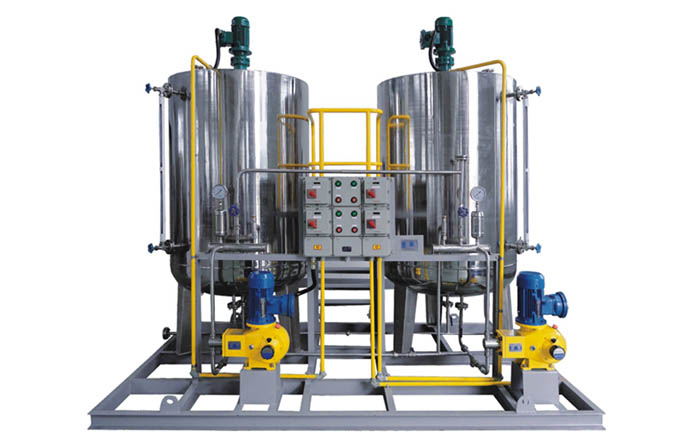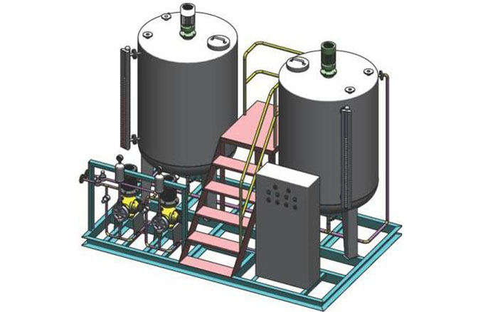2、加藥裝置組成結構有:溶液箱、液位計、計量箱、攪拌器、加藥計量泵、安全閥、壓力表、控制柜、閥門以及管路集中布置,各部件的材質(zhì)主要分不銹鋼和碳鋼襯膠。